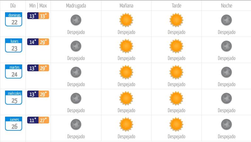 Respecto a los próximos días, la temperatura bajará considerablemente con cifras bajo los 30 grados. Incluso, el próximo jueves 26 de enero habrá una máxima de solo 27 grados, pese a que también estará despejado.