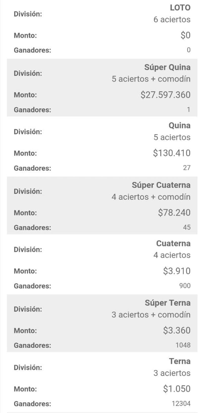 En la categoría de Loto 6 aciertos no hubo ganadores, al igual que en Revancha, Recargado, Desquite y Jubilazo. Aunque en la categoría Súper Quina + comodín, una persona se llevó $27.597.360.