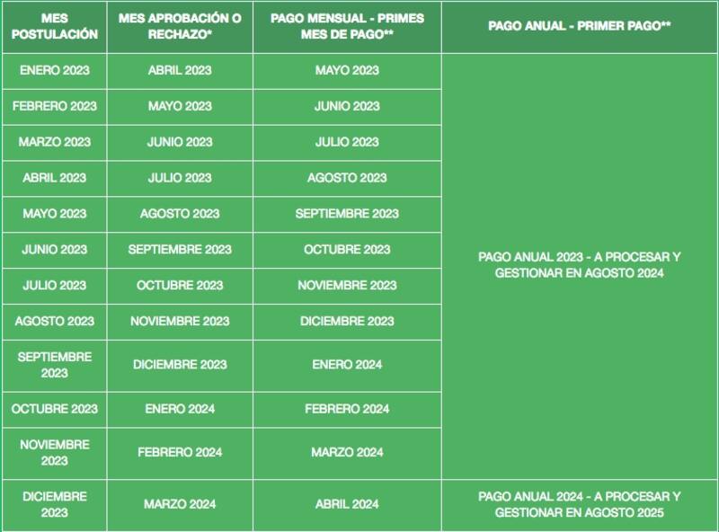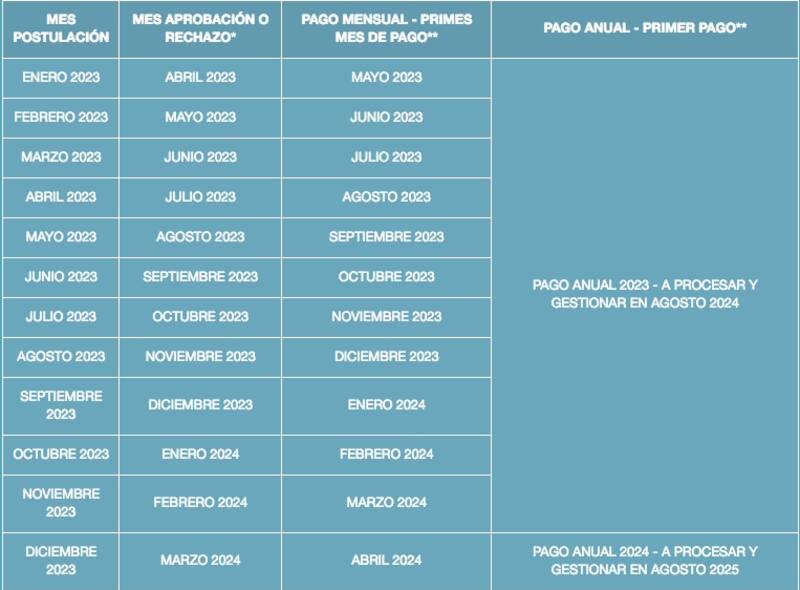 Tal como el beneficio anterior, los pagos de modalidad anual se reciben todos en el mes de agosto, con un año de desfase desde la postulación, y los de modalidad mensual se reciben los últimos días hábiles de cada mes, con un desfase de 2 meses y 4 meses desde la postulación.