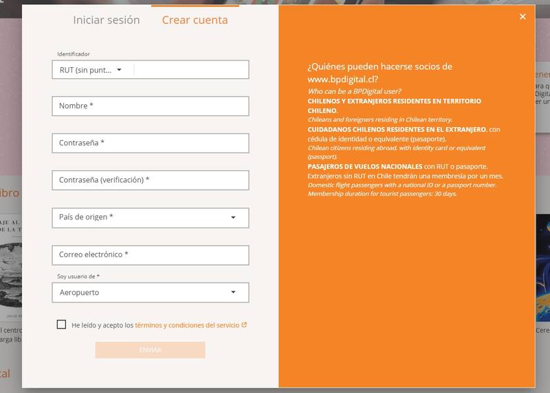 Para solicitar alguno, primero deberás crear una cuenta en el sitio web de la BPD. Presiona "Registrarte" en la parte superior de la pantalla y rellena el formulario, el que solo te solicitará tu nombre, RUT, una clave para proteger tus datos, país de origen, correo electrónico y si eres usuario de alguna otra biblioteca pública.
