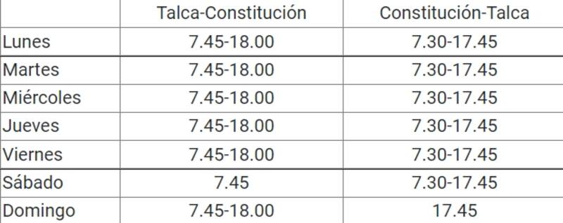 Tiene 11 estaciones, siendo Talca la última y la combinación con el Tren de larga distancia entre Chillán y Estación Central. El valor de los pasajes para turistas nacionales es de $2.250 y se pueden adquirir en Talca o a través de la página de EFE.