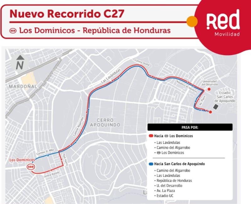Nuevo recorrido C27: Conecta el sector de República de Honduras y Camino Las Lavándulas con el Metro Los Dominicos. Este servicio funcionará de lunes a viernes entre 05:30 y 22:40 hrs. Sábados entre 06:00 y 22:40 hrs. y domingos y festivos entre 06:30 y 22:30 hrs.