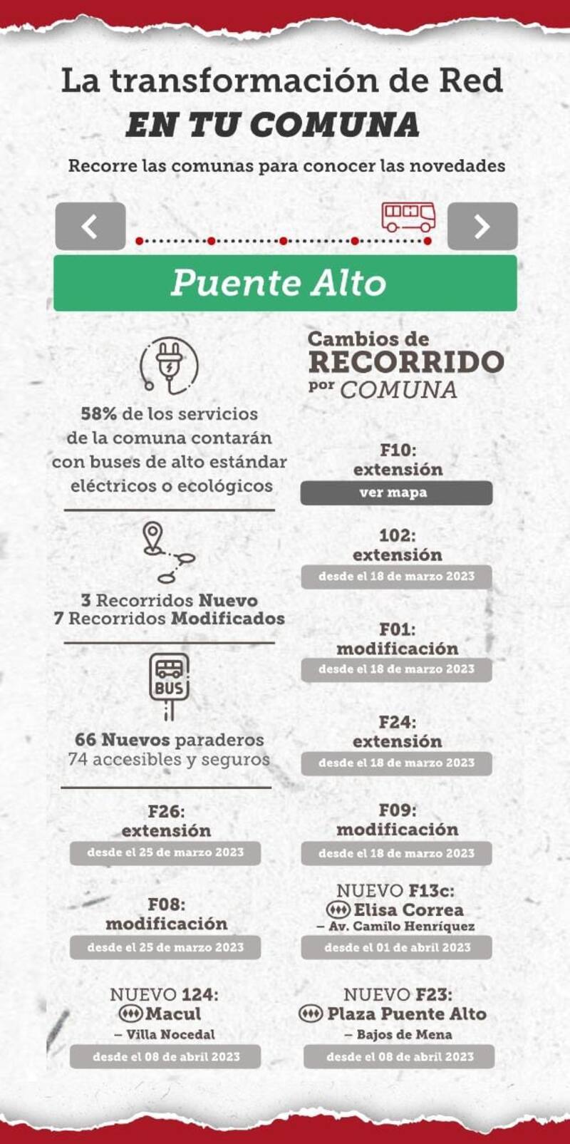 Dentro de estos cambios se encuentra la alteración del recorrido F10 en Puente Alto. Esta situación se replicará en otros servicios, además de expandirlos y crear nuevos.