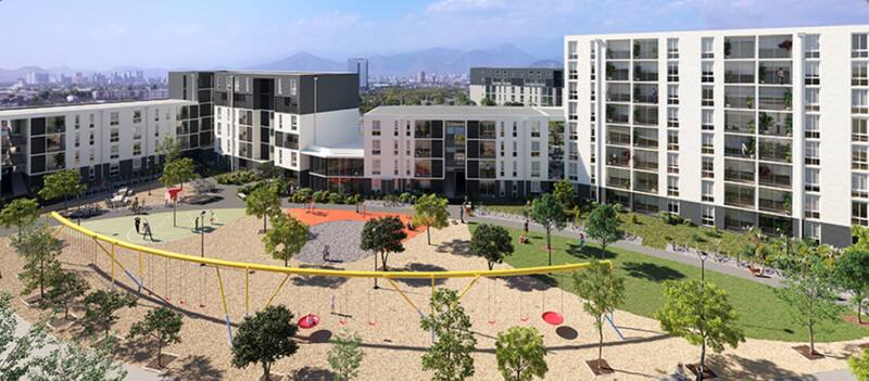 El Condominio Viento Norte y Sur, un espacio de más de 19,000 m² a pasos del Parque Bicentenario. Este innovador proyecto consta de 4 condominios con edificios de 4 a 8 pisos, junto con 14 locales comerciales distribuidos en las torres. Su arquitectura y diseño urbano sustentable son únicos en Chile, fomentando el encuentro y la integración entre los residentes. Amplias áreas verdes en patios y circulación central reducen las temperaturas, y aperturas estratégicas permiten una ventilación natural desde el interior del complejo