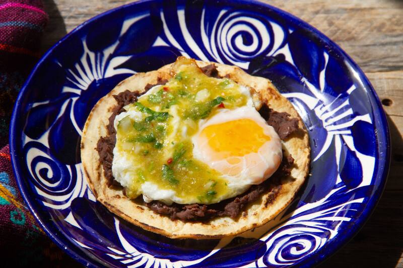 5. Desayuno mexicano con huevos rancheros: Sirve huevos rancheros con tortillas de maíz, porotos refritos, salsa casera, palta en rodajas y un toque de queso fresco desmenuzado.