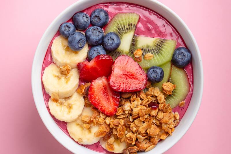 9. Smoothie bowl tropical: Prepara un smoothie bowl con base de plátano y mango, cubierto con rodajas de kiwi, granola, coco rallado y semillas de chía.