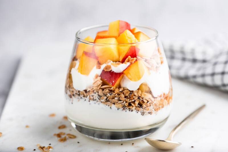 4. Desayuno saludable de yogur: Arma un tazón de yogur griego natural con granola casera, frutas frescas picadas, nueces y un toque de miel o jarabe de agave.