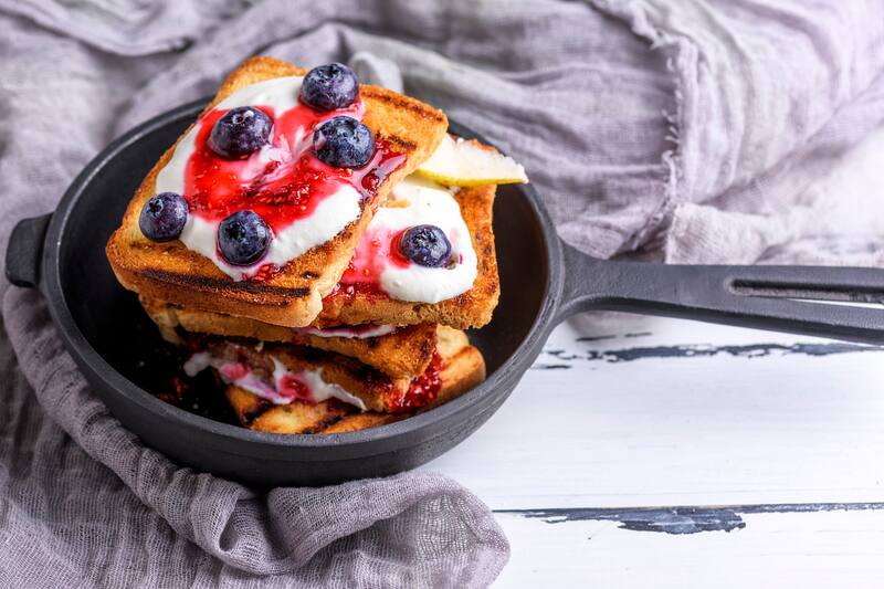 6. Tostadas francesas rellenas: Prepara tostadas francesas rellenas con crema de queso y frutillas frescas. Sírvelas espolvoreadas con azúcar glass y acompañadas de un poco de jarabe de arce.