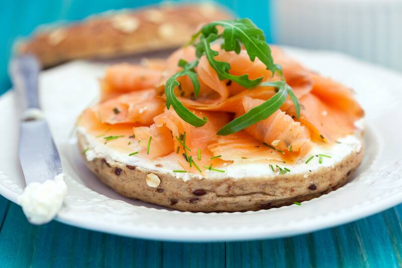 10. Desayuno gourmet de salmón ahumado: Sirve bagels recién horneados con crema de queso, salmón ahumado, alcaparras, rodajas de tomate y cebolla roja. Acompaña con jugo de naranja recién exprimido.