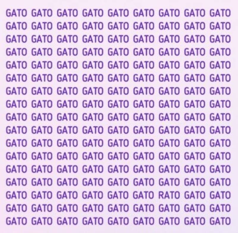 El reto de hoy consiste en encontrar la palabra "RATO". Esta se encuentra camuflada en medio de palabras que a simple vista se escriben de manera casi idéntica y solo podrás distinguirla buscando las diferencias mínimas que hay en ellas. Así que concéntrate y observa detenidamente la imagen, recuerda que solo tienes 10 segundos para lograrlo. ¿Te atreves?
