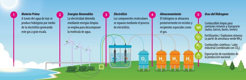 De este modo, según señala el Ministerio de Energía que hay cuatro pasos para que se produzca y pueda darse uso de este hidrógeno.