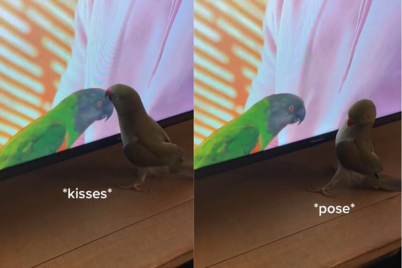 "Hello baby girl" es lo primero que dice el loro a la televisión, para luego comenzar a darle besos y "posar" para causar un mayor impacto y llamar la atención de su enamorada.