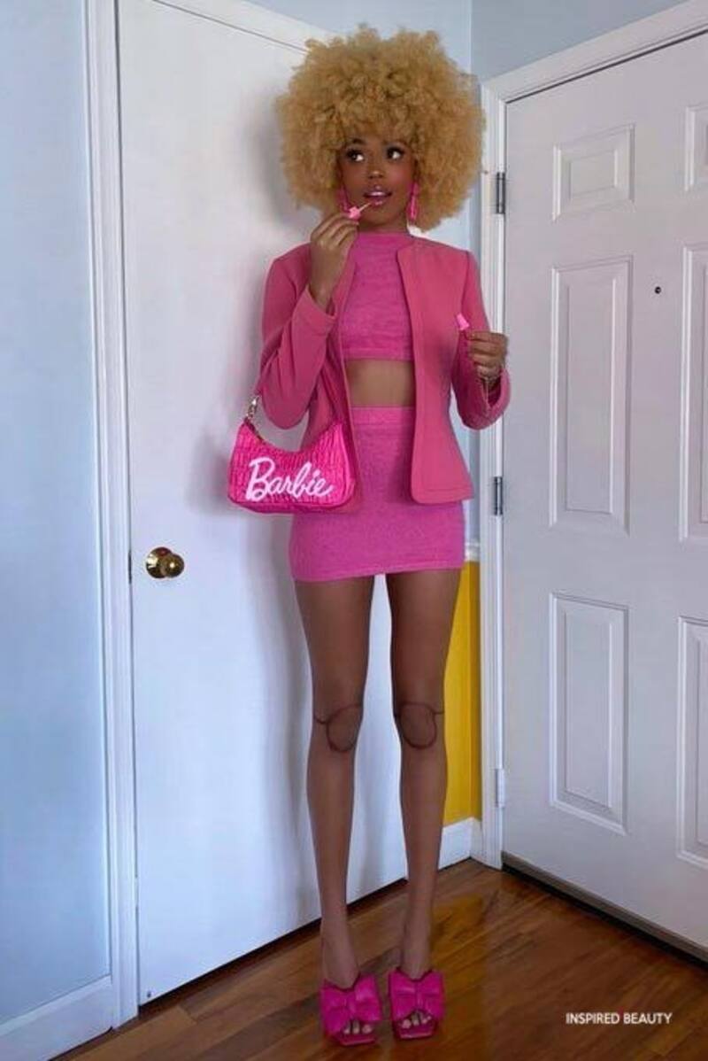 Para este adorable y clásico disfraz sólo necesitas una teñida en tonos rosa o pasteles, un lindo peinado y el típico maquillaje de Barbie, párpados celestes, pestañas bien crespas y labios rosados.