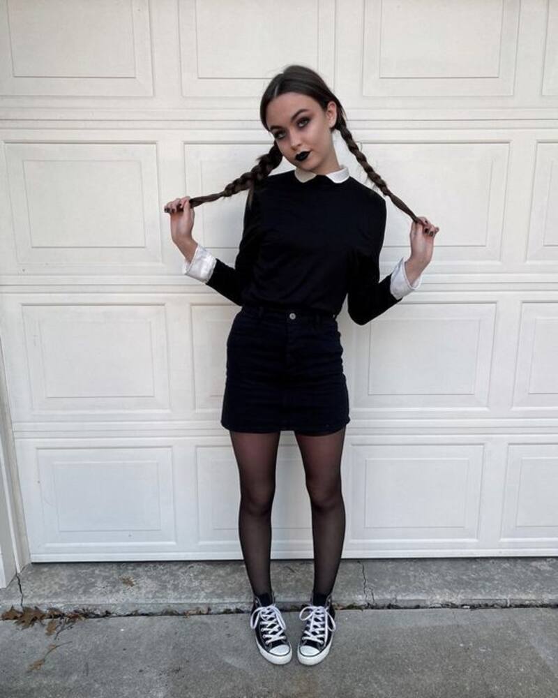 Con el estreno de su serie pronta a llegar, Merlina será uno de los favoritos este 31 de octubre, y su atuendo no es tan difícil de recrear, solo necesitas un vestido largo negro, o una polera y falda, si puedes agrega un cuello blanco, unas trenzas y un maquillaje oscuro. ¡Listo!.