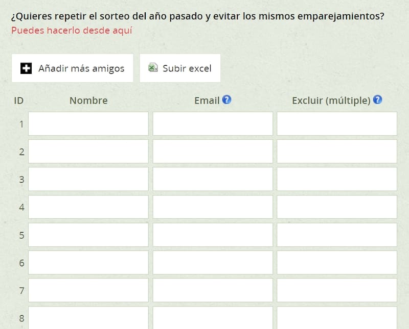 En Amigo Invisible tendrás una lista que rellenar con nombres y correos electrónicos, que incluso puedes completar añadiendo una tabla de Excel. Además, también da la opción de escribir si es que hay alguna persona que no puede dar o recibir regalos de otra.