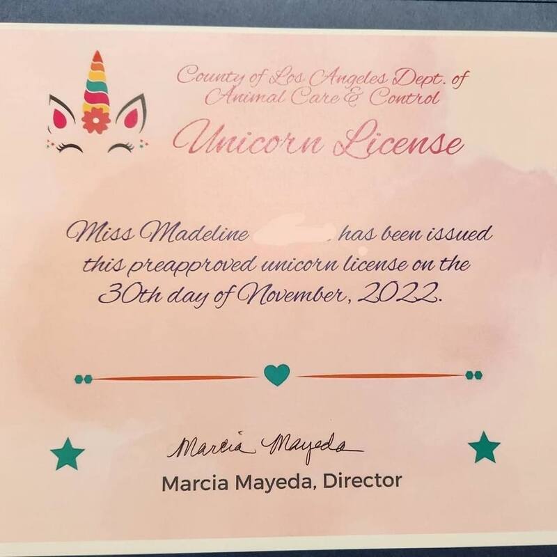Una pequeña niña, identificada como Madeline, recibió un permiso gubernamental por parte del Departamento de Control y Cuidado de Animales de Los Ángeles para tener a un unicornio como mascota en casa, en caso de encontrar alguno alguna vez.
