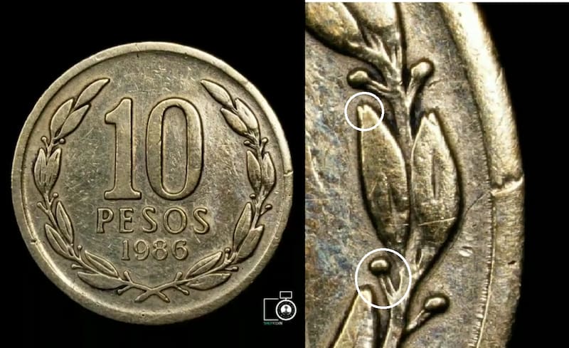 Moneda de 10 pesos de 1986 con variante "doble fruto"