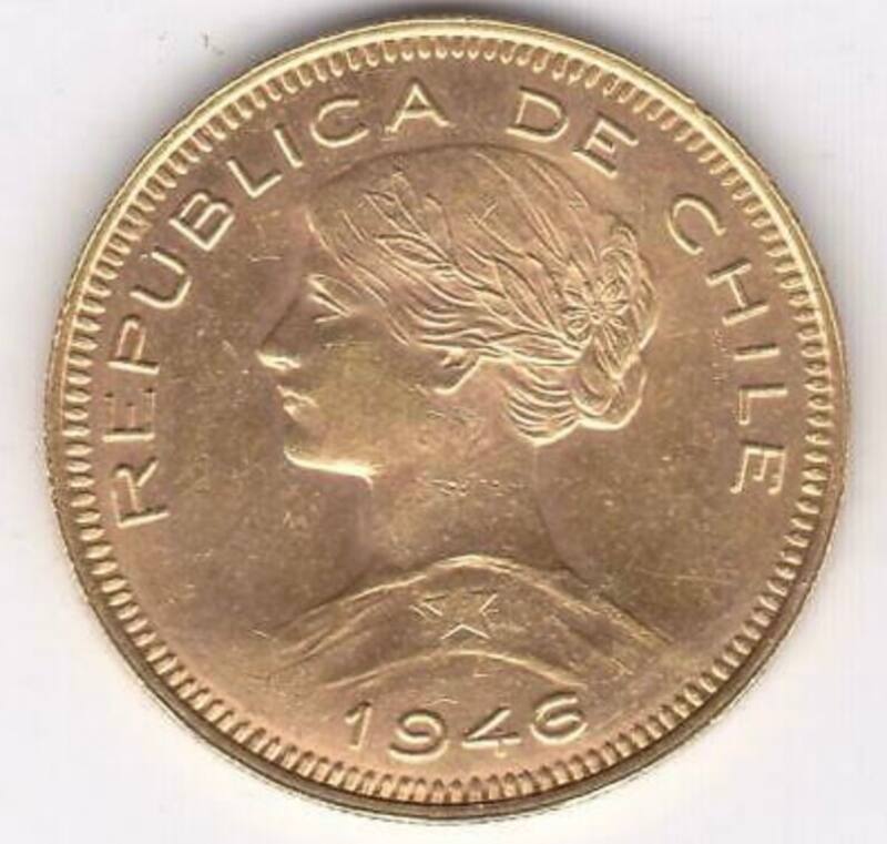La moneda de oro de 100 pesos chilena es conocida como "Peso Libertad", y no fue una moneda enfocada en la circulación, sino que es netamente una moneda de colección, que se fabricó entre 1932 y 1962. En particular, esta moneda se produjo en 1946, y forma parte de una camada de 260.000 unidades.