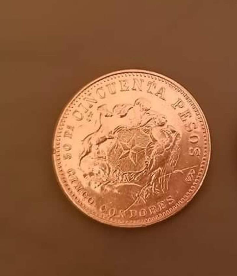 La moneda es del año 1965, y corresponde a una serie de colección que no tuvo circulación. Es de 50 pesos y tiene un 90% oro, con cobre y níquel. El oro es de 21 quilates y pesa en total 10,17 gramos, lo que aumentaría su valor.