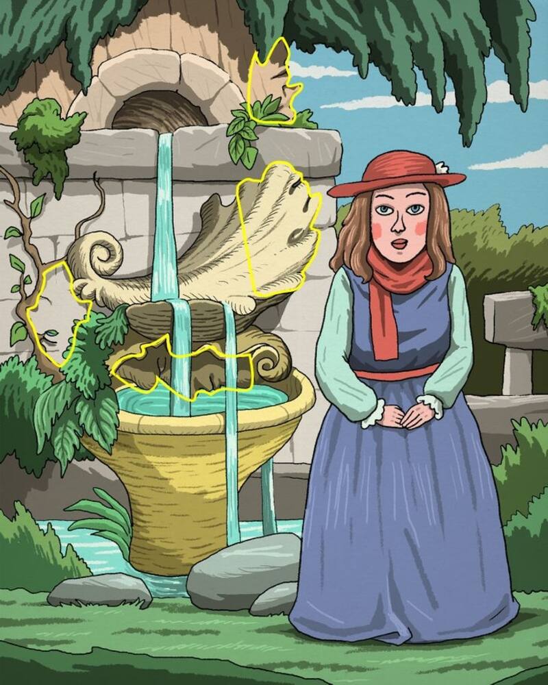 Ahora te presentaremos una en donde se aprecia a una mujer parada frente a una fuente. En ella hay cuatro rostros ocultos que debes encontrar, pero, atentos, el de la mujer no es uno de ellos.