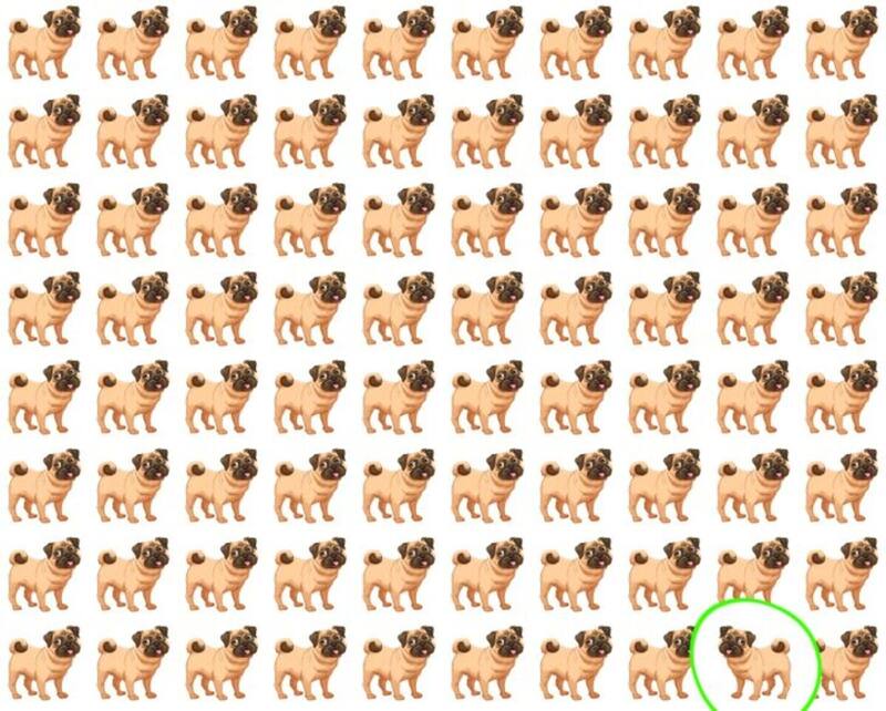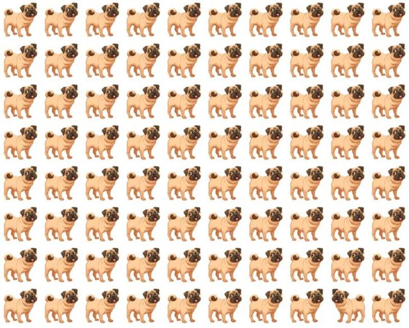 Observa la imagen con mucha detención y trata de hallar dónde está el perro de la raza pug que luce diferente al resto. Mira cada detalle de los dibujos.