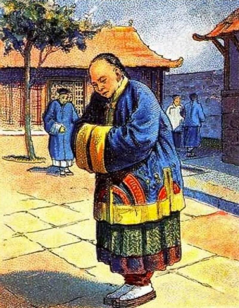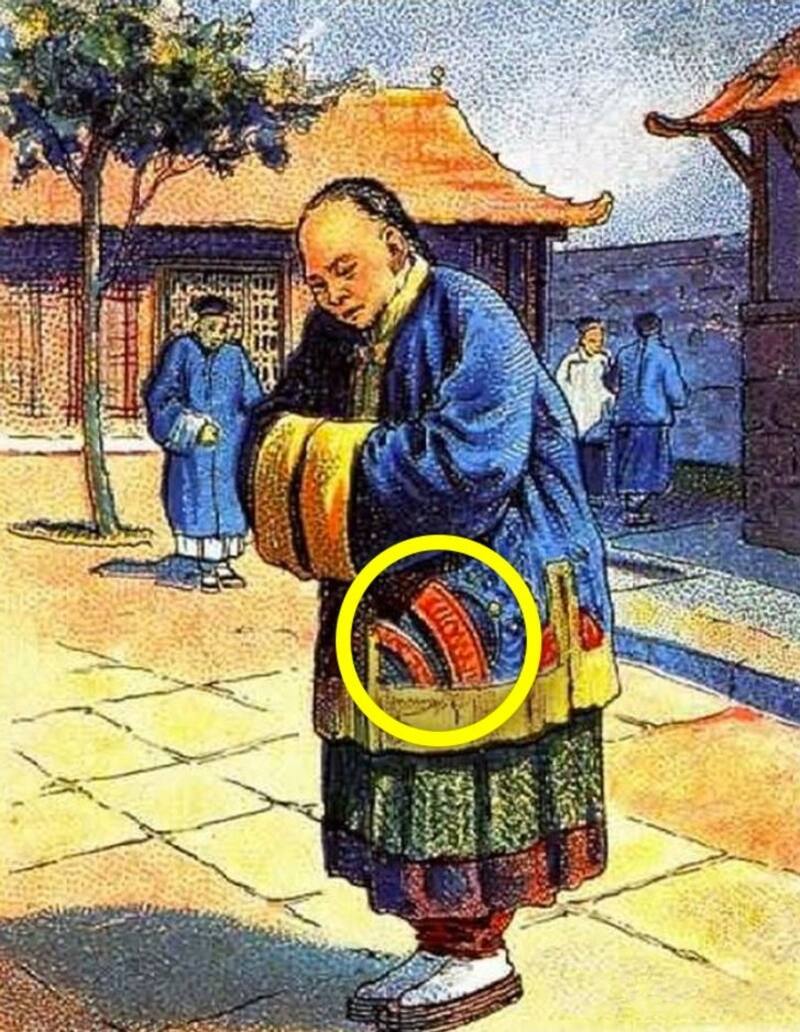 Si observas la ropa del sujeto a la altura de su estómago, te darás cuenta que existen unas cintas rojas con una copa azul, ese es el gorro del hombre. Te lo mostramos en la imagen a continuación.