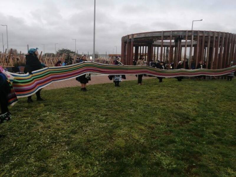 Luego de un largo trabajo, las mujeres lograron tejer un telar de 50 centímetros de ancho y un kilómetro de largo, utilizando los colores del "relmu", arcoíris en idioma mapudungun.
