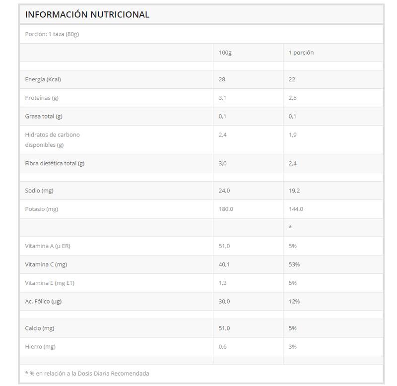 Asimismo, según la tabla nutricional de esta verdura, considerando como una porción 1 taza (80 g), aporta lo siguiente: