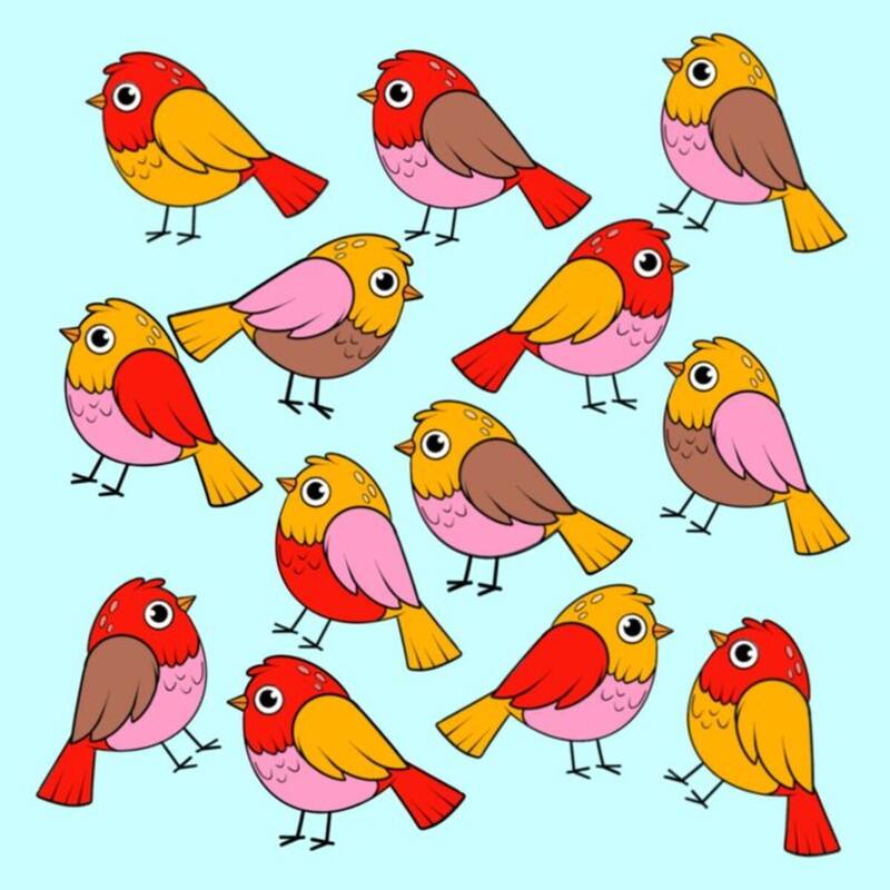 Observa la ilustración y trata de encontrar dónde está la única ave que no tiene un par, ya que el resto tiene a otros pájaros que lucen igual. Fíjate en los colores y detalles de cada una.
