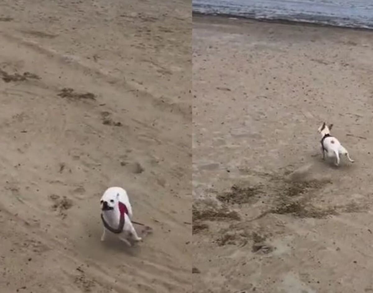 En el video viral se ve a la pequeña can girando muy rápido en círculos y corriendo a una gran velocidad por la arena, acompañada del ritmo de la canción "What A Feeling" de Irene Cara.