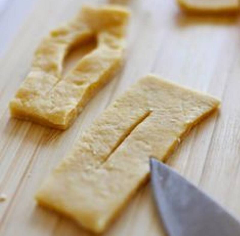 - Corta en rectángulos de 10x4cm y con un cuchillo haz un corte en el centro.