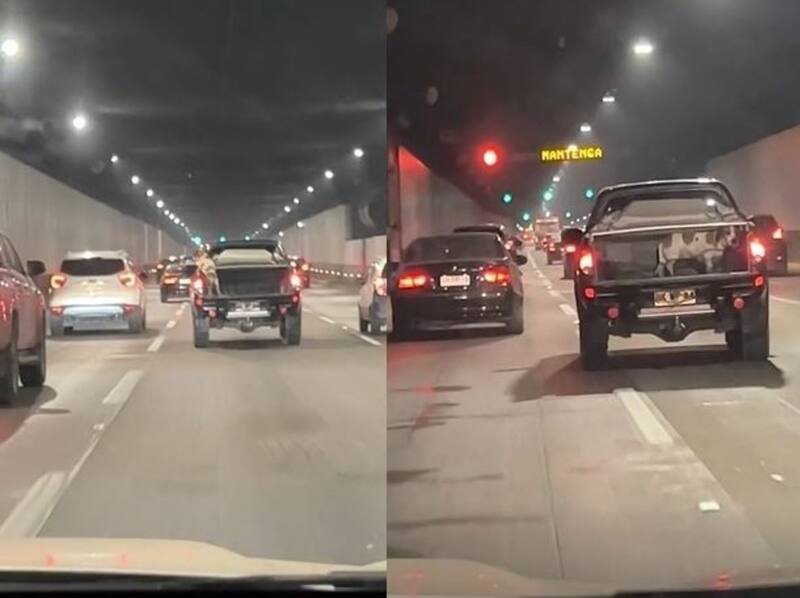 Un insólito hecho fue captado por una veterinaria en la Autopista Costanera Norte, en la ciudad de Santiago: unas personas transportaban a un perro en la parte trasera de una camioneta pickup, sin correa y con el portalón abierto.