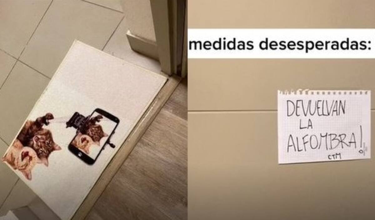 La cuenta @cami.flin publicó el video señalando: "Storytime de cuando creímos que nos robaron la alfombra de entrada". Todo comenzó cuando volvieron a su departamento, y no estaba el limpiapiés, uno muy original donde aparecen dos gatitos sonrientes tomándose una selfie.