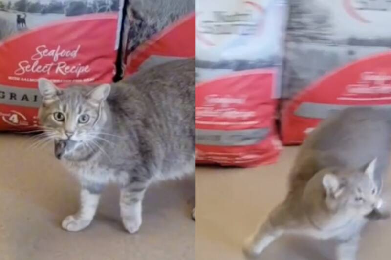 El video capta el momento en que el gato atrapa al roedor e intenta llevarlo dentro del local, a lo que la persona que está grabando le pide al felino "¿Puedes llevártela hacia afuera?"