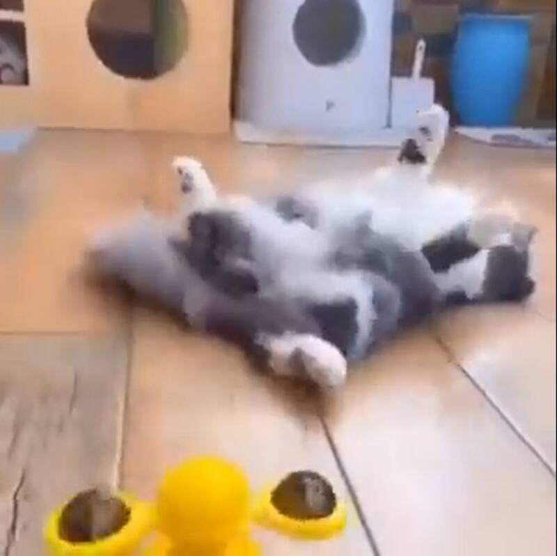 En el video se puede ver como el minino está parado frente al artefacto que no para de girar, y luego de mirarlo por unos segundos se cae al piso.