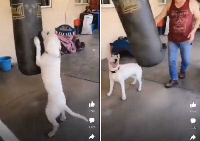 En ese momento el animalito salta, 'patea' y da golpes al costal en al menos cuatro ocasiones, mientras su humano lo alienta y la persona que lo graba no puede contener la risa de la impresión y ternura al ver lo que hace su mascota.