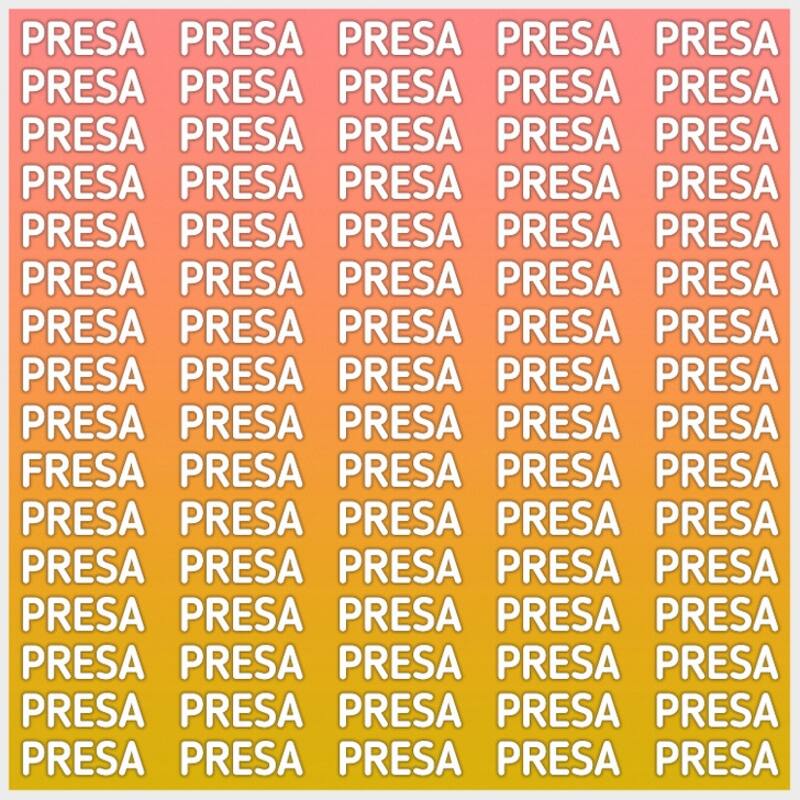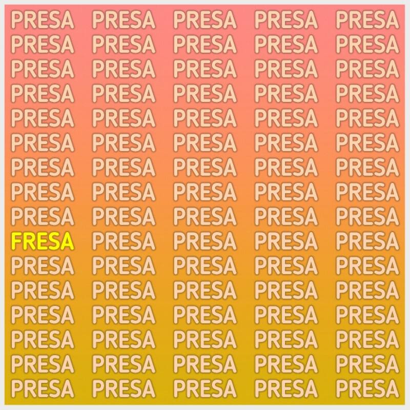 Trata de localizar donde está la palabra FRESA oculta en una imagen llena de otras que dicen PRESA. Idealmente, deberás resolver este acertijo en 7 segundos o menos, pero si no has logrado completar el desafío en ese tiempo, ¡no te preocupes! Puedes tomarte los segundos o minutos que necesites para hallarla, lo importante es que estás ejercitando tu mente.