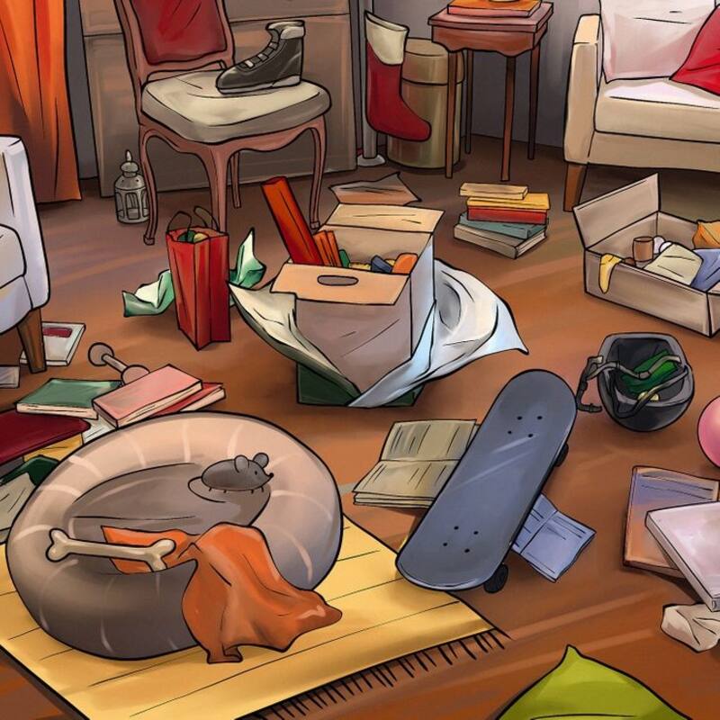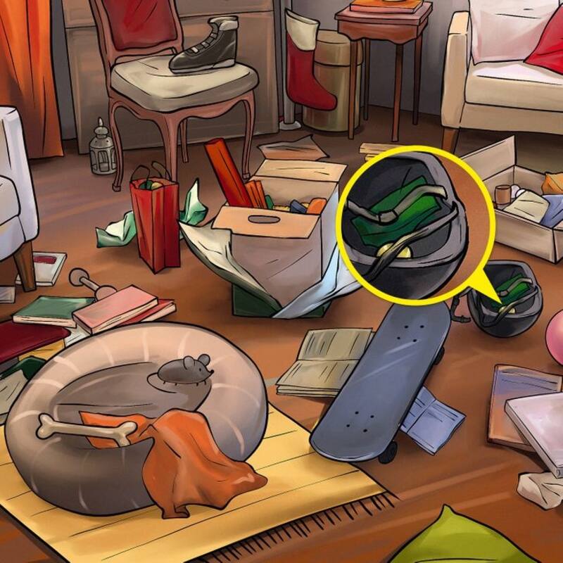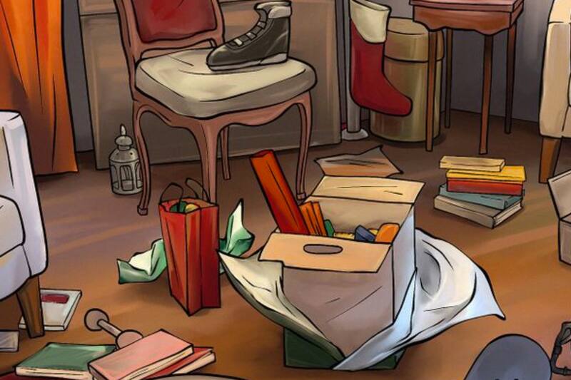 En esta imagen podrás ver una habitación que esta repleta de diferentes objetos, uno de ellos es una pelota de tenis. Este último está en algún lugar del dibujo.