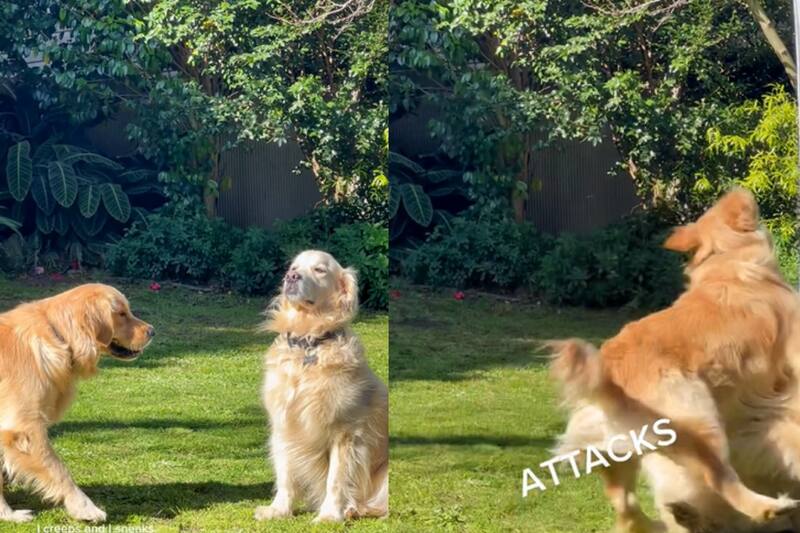 Tal como se puede ver en la grabación, los perritos golden retriever se encontraban en el patio de su hogar, uno muy tranquilo mientras el otro se acerca sigilosamente, sin dejar ver sus verdaderas intenciones.