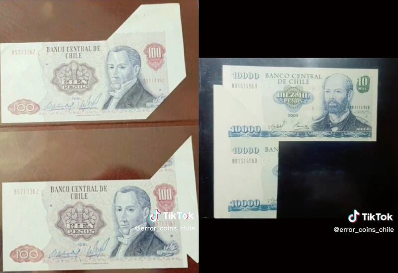 Ignacio Villalón, experto en el tema, subió un video a su popular cuenta de TikTok "Error Coins Chile" donde mostró algunos billetes con fallas en su impresión, junto al precio que pueden llegar a pagar los coleccionistas.