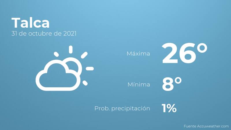 Según la información de accuweather.com, hoy por la mañana en Talca tendremos nubes y claros. Según pasen las horas se esperan nubes y claros. Con respecto a las temperaturas, estas oscilarán entre los 26 grados de máxima y 8 de mínima. Viento de poca intensidad con rachas de hasta 20 km/h.