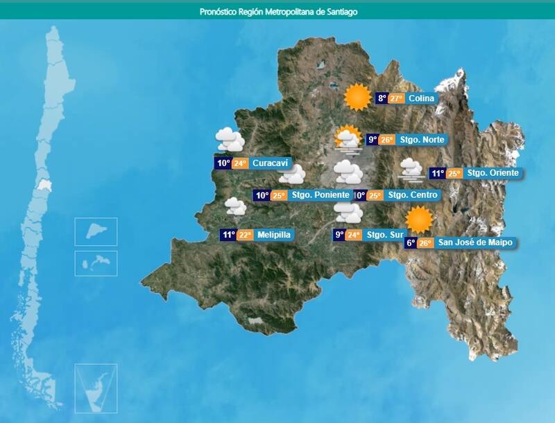 A su vez, la máxima temperatura será alcanzada a las 15:00 horas y llegará a los 26° en Santiago, aunque en Colina llegará a 27°.