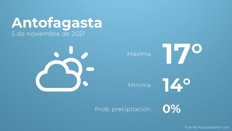 Según la información de accuweather.com, hoy por la mañana en Antofagasta se prevé nubes escasas. Según pasen las horas habrá más nubes que claros. Las temperaturas oscilarán entre una máxima de 17 y una mínima de 14 grados centígrados. Viento del suroeste de carácter flojo con cifras de hasta 20 km/h.
