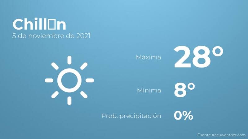 Según la información de accuweather.com, hoy por la mañana en Chillán tendremos cielos sin nubes. A medida que avance el día se prevén cielos despejados. Las temperaturas se moverán entre una máxima de 28 y una mínima de 8 grados centígrados. Junto a todo esto, se esperan vientos de poca intensidad con cifras de hasta 18 kilómetros por hora.
