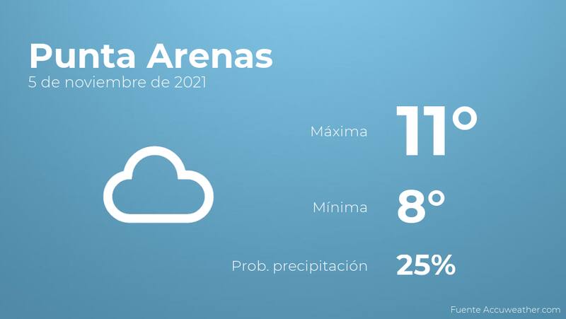 Según la información de accuweather.com, hoy por la mañana en Punta Arenas estará muy nublado con poca probabilidad de lluvias. Por la tarde estará muy nublado con poca probabilidad de precipitaciones. En relación a las temperaturas, estas variarán entre una máxima de 11 y una mínima de 8 grados. Además, se esperan vientos del noroeste con cifras de hasta 44 km/h.