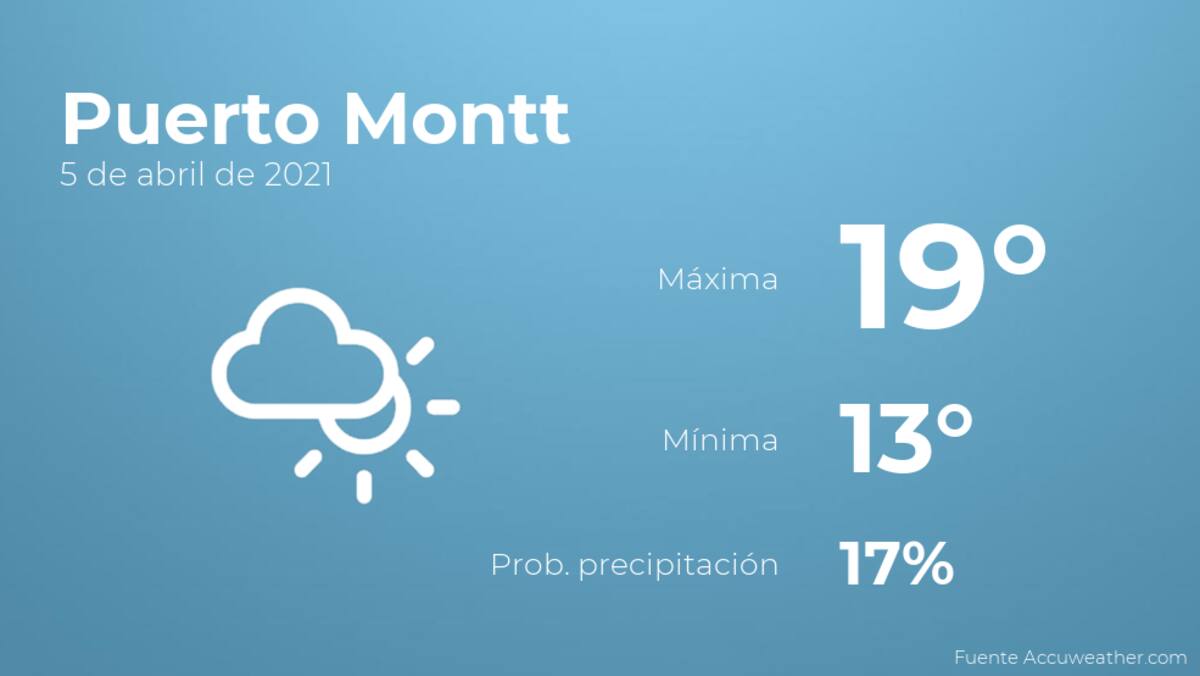 Según la información de accuweather.com, hoy por la mañana en Puerto Montt se esperan más nubes que claros con baja probabilidad de que haya precipitaciones. Según pasen las horas se prevén cielos cubiertos con lloviznas generalizadas. En cuanto a las temperaturas, estas se moverán entre una máxima de 19 y una mínima de 13 grados. Además, se esperan vientos del norte de carácter débil con cifras de hasta 24 km/h.