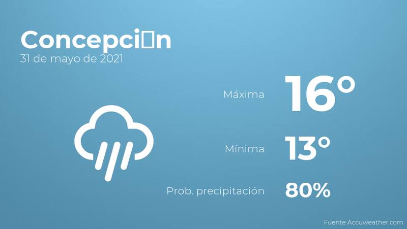 Según la información de accuweather.com, hoy por la mañana en Concepción el cielo estará cubierto con lluvia. A medida que avance el día se prevén cielos cubiertos con lloviznas generalizadas. Por lo que respecta a las temperaturas, estas oscilarán entre los 16 grados de máxima y 13 de mínima. Junto a todo esto, se esperan vientos de carácter flojo con rachas de hasta 22 km/h.