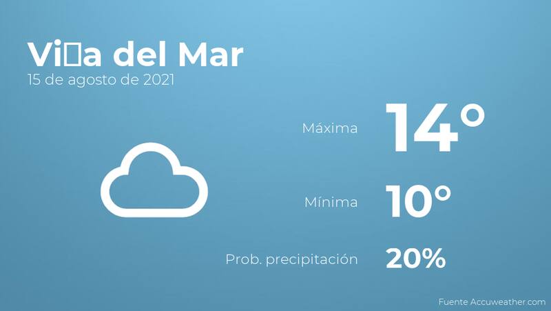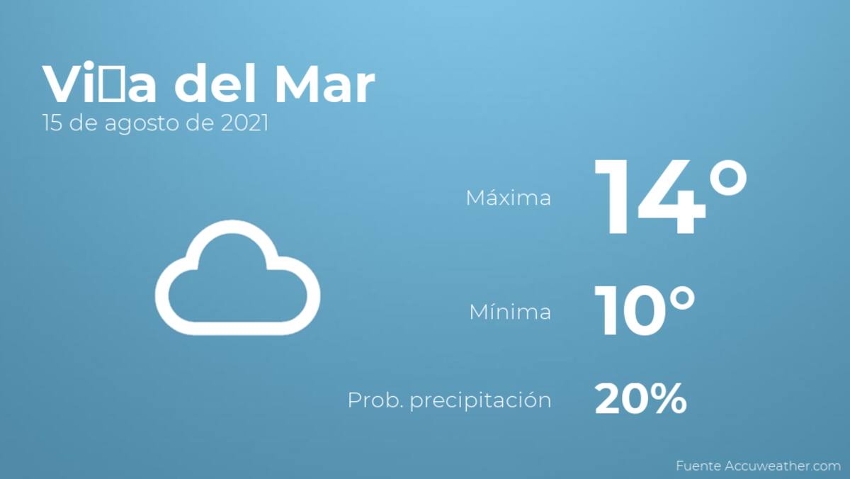 Según la información de accuweather.com, hoy por la mañana en Viña del Mar habrá cielos nubosos con poca probabilidad de precipitaciones. A medida que avance el día habrá cielos nubosos con poca probabilidad de lluvias. En cuanto a las temperaturas, estas se moverán entre una máxima de 14 y una mínima de 10 grados. Además, se esperan vientos de carácter débil con cifras de hasta 17 kilómetros por hora.