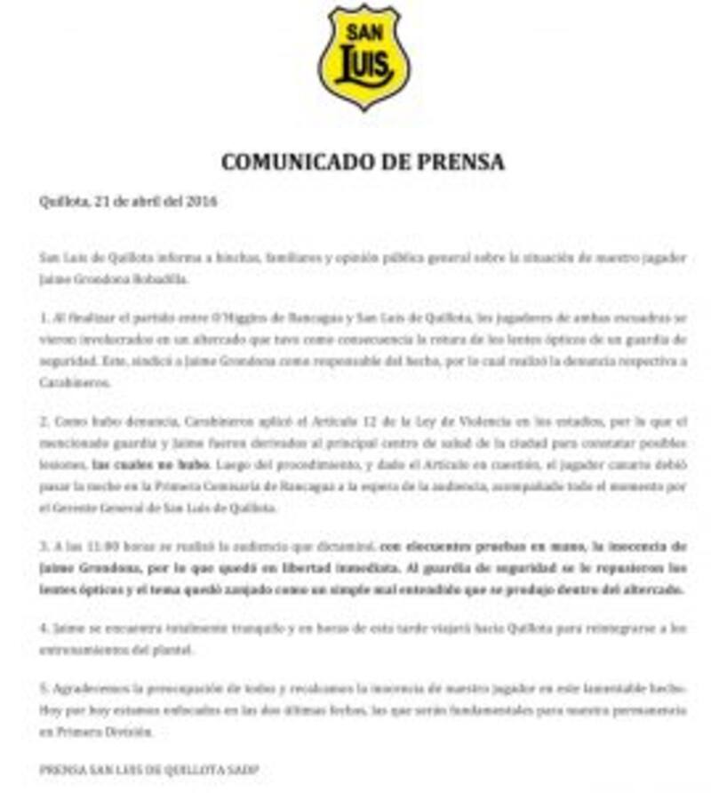 En tanto, el cuadro de San Luis de Quillota emitió el siguiente comunicado que destacaba "con elocuentes pruebas en mano, se dictaminó la inocencia de Jaime Grondona, por lo que quedó en libertad inmediata"