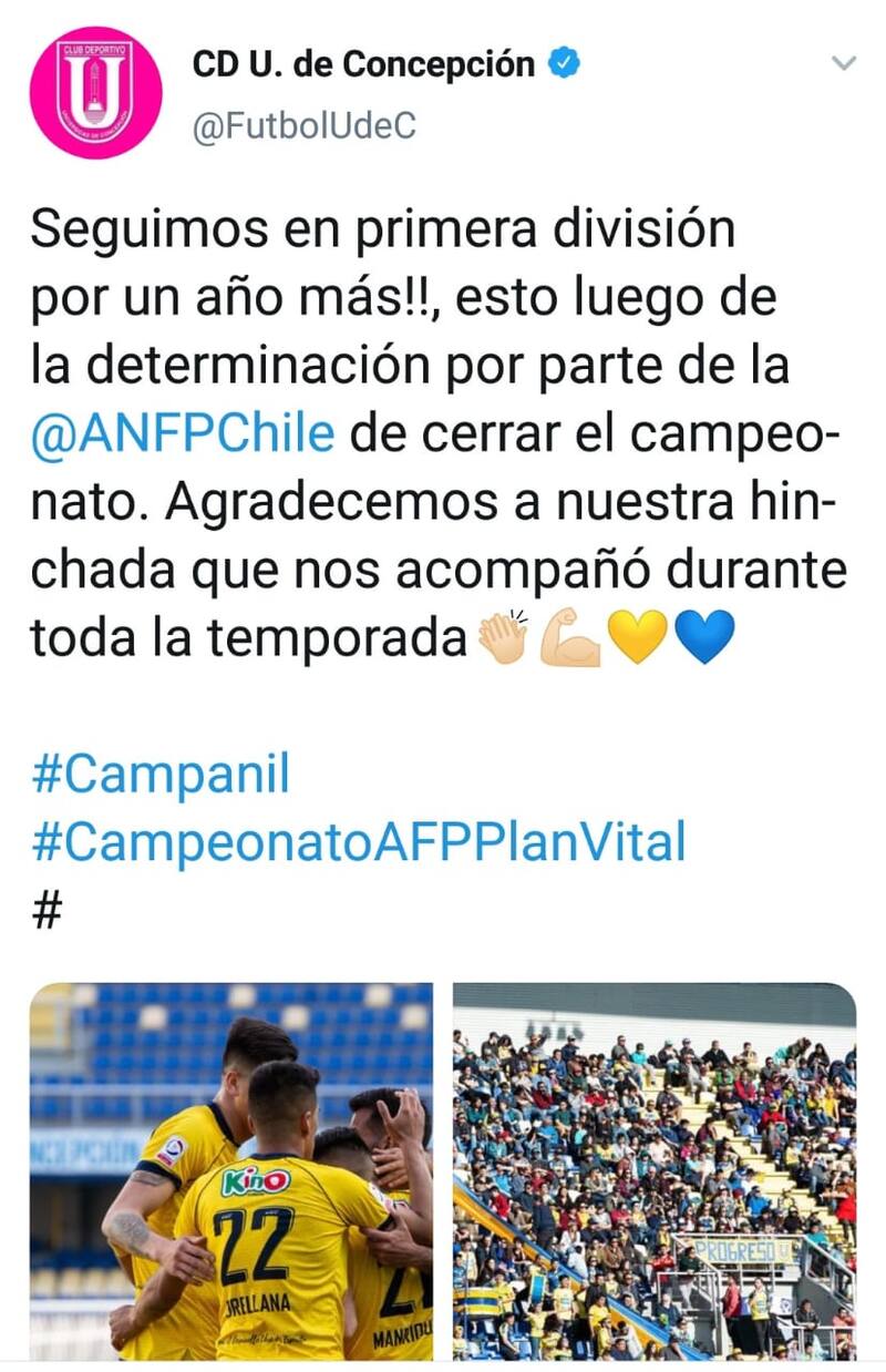 "Seguimos en Primera División por un año más!, esto luego de la determinación de la ANFP de cerrar el campeonato. Agradecemos a nuestra hinchada que nos acompañó durante toda la temporada", fue lo que escribió en club en sus redes sociales, el cual después fue eliminado.